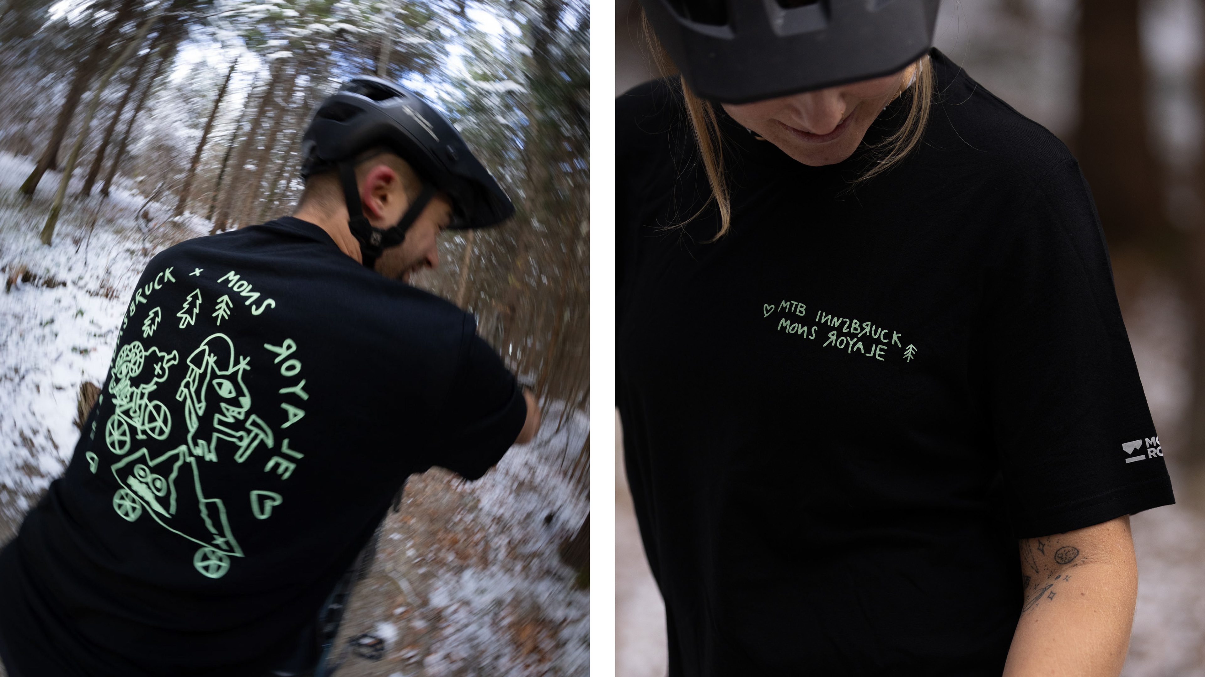 Illustration design for a collaborative t-shirt between MTB Innsbruck and Mons Royale. The artwork features playful characters representing the MTB Innsbruck community, bringing humor and personality to the piece.